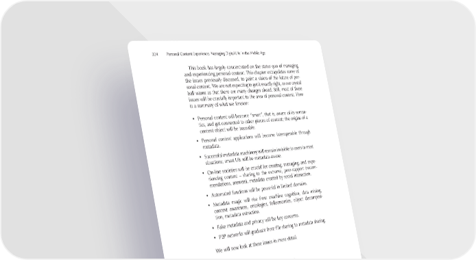 324 Personal Content Experience: Managing Digital Life in the Mobile Age This book has largely concentrated on the status quo of managing and experiencing personal content. This chapter extrapolates some of the issues previously discussed, to paint a vision of the future of per- sonal content. We are not expecting to get it exactly right, as our crystal ball warns us that there are many changes ahead. Still, most of these issues will be crucially important to the area of personal content. Here is a summary of what we foresee: • Personal content will become “smart”, that is, aware of its seman- tics, and get connected to other pieces of content; the origins of a content object will be traceable. • Personal content applications will become interoperable through metadata. • Successful metadata machinery will remain invisible to users in most situations; smart UIs will be metadata-aware. • On-line societies will be crucial for creating, managing, and expe- riencing content – sharing to the extreme, peer-support (recom- mendations, answers), metadata created by social interaction. • Automated functions will be powerful in limited domains. • Metadata magic will rise from machine cognition, data mining, context awareness, ontologies, folksonomies, object decomposi- tion, metadata extraction. • Fake metadata and privacy will be key concerns. • P2P networks will graduate from fi le sharing to metadata sharing. We will now look at these issues in more detail. 8.1 Metadata in the Years to Come Throughout this book, we have stressed the importance of metadata as a key technology that is needed for preventing the personal content boom to explode in our faces. There are some potential directions that metadata-related technologies will evolve. The following factors describe those directions: Drivers: the explosive growth of digital content will drive the need for metadata. Mere fi le attributes, such as name and date, do not suf- fi ciently describe its contents and cannot reveal the fi ne-grained dif- ferences of the content objects that are (partially) created and edited