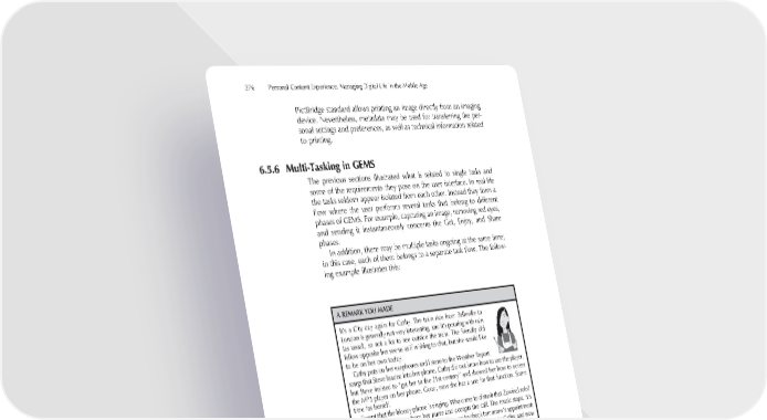 276 Personal Content Experience: Managing Digital Life in the Mobile Age PictBridge standard allows printing an image directly from an imaging device. Nevertheless, metadata may be used for transferring the per- sonal settings and preferences, as well as technical information related to printing. 6.5.6 Multi-Tasking in GEMS The previous sections illustrated what is related to single tasks and some of the requirements they pose on the user interface. In real life the tasks seldom appear isolated from each other. Instead they form a fl ow where the user performs several tasks that belong to different phases of GEMS. For example, capturing an image, removing red eyes, and sending it instantaneously concerns the Get, Enjoy, and Share phases. In addition, there may be multiple tasks ongoing at the same time; in this case, each of them belongs to a separate task fl ow. The follow- ing example illustrates this: A REMARK YOU MADE It’s a City day again for Cathy. The train ride from Belleville to London is generally not very interesting, and it’s pouring with rain (as usual), so not a lot to see outside the train. The friendly old fellow opposite her seems as if wishing to chat, but she would like to be on her own today. Cathy puts on her earphones and listens to the Weather Report songs that Steve loaded into her phone. Cathy did not know how to use the player, but Steve insisted to “get her to the 21st century” and showed her how to access the MP3 player on her phone. Good; now she has a use for that function. Some time for herself. Except that the bloody phone is ringing. Who dares to disturb that Zawinal solo? Cathy takes the phone from her purse and accepts the call. The music stops. It’s Deena – she has lost her phone and would need to check tomorrow’s appointment with the curator. Deena had sent a copy of the calendar event to Cathy and now asks her to check the time. Cathy is bewildered by this task. She does not use the calendar, preferring her scribbled notes, but Deena keeps sending her those electronic appointments. Well, she could try, but how do you get to the calendar when there’s a call on? Steve, help! Cathy explains her problem to Deena, feeling lost. That old chap next to her appears to be listening, and fi nally raises his hand as if wishing to join the conver- sation. Cathy is a little annoyed at fi rst, but that quickly turns to relief after the man explains how she can access all phone functions with that Menu button, even while speaking on the phone. That works! Cathy goes to the calendar and, after some fumbling, informs Deena that her meeting will be at 11:00 am.
