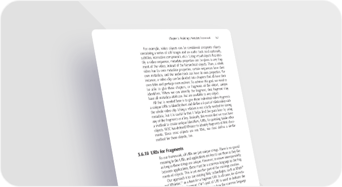 Chapter 5: Realizing a Metadata Framework 167 For example, video objects can be considered composite objects containing a series of still images and an audio track (and optionally, subtitles, interactive components, etc.). Using virtual objects that iden- tify a video sequence, metadata properties can be given to any frag- ment of the video, instead of the hierarchical objects. Then, a whole video has its own metadata properties, certain sequences have their own metadata, and the audio track can have its own properties. For instance, a video clip can be divided into chapters that all have their own titles and perhaps even authors. To achieve this goal, we need to be able to give these chapters, or fragments of the object, unique identifi ers. When we can identify the fragment, that fragment may have all metadata attributes that are available to any object. All that is needed here is to give these individual video fragments a unique URIs to identify them and defi ne a is part of relationship with the whole video clip. Using a relation is not strictly needed for storing metadata, but it is useful in that it helps fi nd the parts later by using any of the fragments as a key. Basically, this means that we must have a method to create unique identifi ers, URIs, for pointing inside other objects. W3C has defi ned XPointer to identify fragments of XML docu- ments. Since most objects are not XML, we must defi ne a similar method for these objects, too. 5.6.10 URIs for Fragments To our framework, all URIs are just unique strings. There is no special meaning in the URIs, and applications are free to use them as they like as long as these strings are unique. However, to ensure interoperability between applications, there must be a common language to the frag- ments of objects. This is yet another part of the ontology creation. 24 Our approach is to use existing XML technologies, such as XPath 25 and XPointer, as a basis for a fragment URI. In all cases, for all meta- data objects the fragment (“#”) part of URI is used to indicate the fragment. This section gives an outline on how the common language might be developed. For all objects, the fragment (“#”) part of the URI is used to indicate the fragment. 5.6.10.1 XPointer for XML Documents XPointer Framework is a W3C recommendation for fragment identi- fi ers for any resource that has media type of text/xml or one of other 24 http://www.w3.org/TR/xpath 25 http://www.w3.org/TR/xptr-framework/
