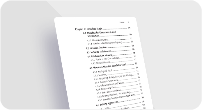 Contents vii Chapter 4: Metadata Magic ............................................ 79 4.1 Metadata for Consumers: A Brief Introduction ........................................................ 80 4.1.1 Metadata Semantics ............................................. 82 4.1.2 Metadata – For Managing or Enjoying? ................ 83 4.2 Metadata Creation .............................................. 84 4.3 Metadata Maintenance ....................................... 90 4.4 Relations Give Meaning ...................................... 91 4.4.1 People as First-Class Metadata ............................. 92 4.4.2 Derived Metadata ................................................ 93 4.5 How does Metadata Benefi t the User? ............... 93 4.5.1 Tracing and Recall ............................................... 94 4.5.2 Searching ............................................................. 94 4.5.3 Organizing: Sorting, Grouping and Filtering ......... 95 4.5.4 Automatic Summarizing ....................................... 96 4.5.5 Enhancing Privacy and Security ............................ 97 4.5.6 Constructing Views .............................................. 97 4.5.7 Better Recommendations ..................................... 98 4.5.8 Reusing / Remixing / Reconstructing .................... 98 4.5.9 Smoother Transition Between Applications .......... 99 4.6 Existing Approaches ............................................ 99 4.6.1 MARC .................................................................. 100 4.6.2 Dublin Core Metadata Initiative ........................... 101 4.6.3 XMP ..................................................................... 103 4.6.4 ID3v2 .................................................................. 104 4.6.5 Acidized Wav ...................................................... 105 4.6.6 DCF and EXIF ...................................................... 107 4.6.7 Quicktime ............................................................ 107 4.6.8 MPEG-7 ............................................................... 108 4.6.9 RSS ...................................................................... 109 4.6.10 Summary ........................................................... 110