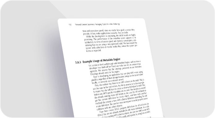 192 Personal Content Experience: Managing Digital Life in the Mobile Age tion and execution speed, since no matter how good a service they provide, if they make applications unusable, they are futile. While the development is continuing, the initial results are highly promising. The performance of the metadata system appears to be satisfactory in terms of access speed and memory consumption, con- sidering that we are using a non-optimized build. We have tested the system with collections of mobile media fi les, where the system per- forms as expected. 5.8.3 Example Usage of Metadata Engine Let us take a short walkthrough with Metadata Engine, and see how a developer (we shall call her Faye) can make use of it in content man- agement. We assume that the ontology presented in our Metadata Ontology already exists in the engine. Faye is developing an application that can play MP3 music using playlists, regardless of their storage location (songs can be stored either locally, or remotely on a network server). First, she notices that there is no MP3 schema in the MdE. This is not the case in the real version, but let us assume so in this example. It means that she will have to create a schema defi nition for MP3 fi les before any MP3 specifi c metadata can be used. She decides to extend the already existing music defi nitions so she uses the API methods to get the current defi nition for music object, and then with another method she creates a new MP3 schema defi nition extending the old music defi nition. She uses her own namespace to avoid property name collisions with any other schema. Faye then creates ID3v2 property defi nitions for all attributes in ID3v2 that are not already included in old music defi nition. As a side benefi t for creating MP3 schema object, she can use MdE as an MP3 search engine to fi nd all MP3s easily and quickly by using it as an MP3 fi lter. Faye’s application scans all MP3 fi les in the device – she creates an MP3 harvester. Besides scanning the device itself, she makes the har- vester scan all available songs from a DLNA certifi ed media server in the home network. She makes it create an instance of MP3 schema object for each MP3 fi le it fi nds, thus creating a metadata instance for each of them. The harvester adds all ID3 tags it fi nds inside the MP3 fi le or from the media server as metadata properties into the instance object. Instance objects contain actual metadata which is stored into database inside MdE as MP3 metadata. Again, our system harvesters will do all MP3 metadata importing automatically, so in real life there
