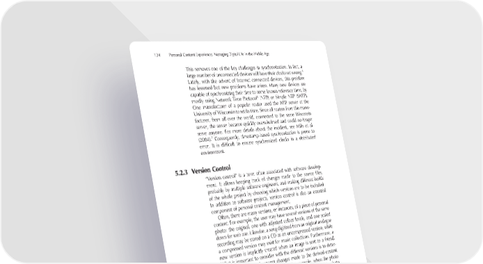 134 Personal Content Experience: Managing Digital Life in the Mobile Age This removes one of the key challenges in synchronization. In fact, a 5 large number of unconnected devices will have their clocks set wrong. Lately, with the advent of Internet connected devices, this problem has lessened but new problems have arisen. Many new devices are capable of synchronizing their time to some known reference time, by 6 mostly using Network Time Protocol (NTP) or Simple NTP (SNTP). One manufacturer of a popular router used the NTP server at the University of Wisconsin to set its time. Since all routers from this manu- facturer, from all over the world, connected to the same Wisconsin server, the server became quickly overwhelmed and could no longer serve anyone. For more details about the incident, see Mills et al. 7 (2004). Consequently, timestamp-based synchronization is prone to error. It is diffi cult to ensure synchronized clocks in a distributed environment. 5.2.3 Version Control “Version control” is a term often associated with software develop- ment. It allows keeping track of changes made to the source fi les, probably by multiple software engineers, and making different builds of the whole project by choosing which versions are to be included. In addition to software projects, version control is also an essential component of personal content management. Often, there are many versions, or instances, of a piece of personal content. For example, the user may have several versions of the same photo: the original, one with adjusted colour levels, and one scaled down for web use. Likewise, a song digitized from an original analogue recording may be stored on a CD as an uncompressed version, while a compressed version may exist for music collections. Furthermore, a new version is implicitly created when an image is sent to a friend. What is important to consider with the different versions is to deter- mine whether the subsequent changes made to the derived content are also refl ected back to the original. For example, when the photo album software in a PC keeps track of how many times a certain photo has been viewed full-screen, should the viewing count for a version of the same image in a mobile device be included as well? 5 This is the mobile version of the infamous blinking “00:00” clock problem commonly seen in VCRs (Video Cassette Recorders) and microwave ovens. Setting the VCR is too complicated for many people, so they just leave the clock unset. 6 http://www.ntp.org 7 http://www.cs.wisc.edu/~plonka/netgear-sntp/, checked 15.12.2006