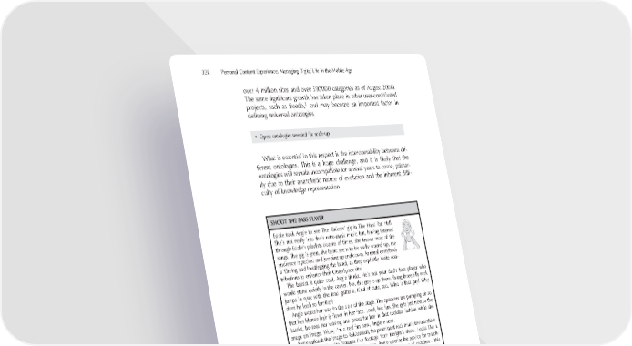 328 Personal Content Experience: Managing Digital Life in the Mobile Age over 4 million sites and over 590 000 categories as of August 2006). The same signifi cant growth has taken place in other user-contributed 2 projects, such as freedb, and may become an important factor in defi ning universal ontologies. • Open ontologies needed for scale-up What is essential in this respect is the interoperability between dif- ferent ontologies. This is a huge challenge, and it is likely that the ontologies will remain incompatible for several years to come, primar- ily due to their anarchistic nature of evolution and the inherent diffi - culty of knowledge representation. SHOOT THE BASS PLAYER Eddie took Angie to see The Kinkees’ gig in The Hard Rat Hall. She’s not really into their retro-punk music but, having listened through Eddie’s playlists dozens of times, she knows most of the songs. The gig is great, the band seem to be really wound up, the audience is packed and jumping up and down. As usual everybody is fi lming and bootlegging the band, as they explicitly invite con- tributions to enhance their OuterSpace site. The bassist is quite cool, Angie thinks. He’s not your dad’s bass player who would stand quietly in the corner. No, this guy is up there, fl ying those silly rock jumps in sync with the lead guitarist. Kind of cute, too. Who is that guy? Why does he look so familiar? Angie works her way to the side of the stage. The speakers are pumping air so that her blonde hair is fl own in her face. Loud, but fun. She gets just next to the bassist, he sees her waving and poses for her in that rockstar fashion while she snaps an image. Wow, I’m a real fan now, Angie muses. Angie uploads the image to RokkenRoll, the prominent rock music trivia archive. Angie sees that the site features live footage from tonight’s show. Looks like a number of people there were uploading too. Angie queries the service for match- ing images of the bass player. It turns out there are hundreds of matches – this guy must be famous – so she limits the search by the context information of the event that other people have already fed in. That’s better, about 15 matches. One of the images has already been tagged with the bassist’s id: Roy Kee. Weird name. The id is a live link, which Angie saves for later perusal. She could also chat with other audience members and locally share footage of the gig, but not now, thanks. Now it’s time to fi nd her way back to Eddie, who’s somewhere there in the middle of that cheering and waving crowd. She jumps in to dance. This music actually rocks after all . . . 2 http://www.freedb.org/