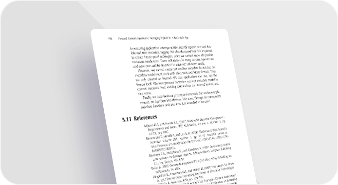 196 Personal Content Experience: Managing Digital Life in the Mobile Age for ensuring application interoperability, but still support easy and fl ex- ible end user metadata tagging. We also discussed how it is important to create future-proof ontologies, since we cannot know all possible metadata needs now. There will always be many content types in use and new ones will be invented to solve yet unknown needs. However, we cannot create yet another metadata format but our metadata model must work with all current and future formats. Thus, we only created an internal API that applications can use, not the format itself. We incorporated harvesters into our metadata model to convert metadata from existing formats into our internal format, and vice versa. Finally, we described our prototype framework that we have imple- mented on Symbian S60 devices. We went through its components and their functions and also how it is intended to be used. 5.11 References Adjeroh D.A. and Nwosu K.C. (1997) Multimedia Database Management – Requirements and Issues, IEEE MultiMedia, Volume 4, Number 3, pp. 24–33, July 1997. Berners-Lee T., Hendler J., and Lassila O. (2001). The Semantic Web. Scientifi c American Volume 284, Number 5, pp. 34–43. Available online at: http://www.sciam.com/article.cfm?articleID=00048144-10D2-1C70- 84A9809EC588EF21. Bernstein P.A., Hadzilacos V., and Goodman N. (1987) Concurrency control and recovery in database systems. Addison-Wesley Longman Publishing Co., Inc. Boston, MA, USA. Boiko B. (2005) Content Management Bible (2nd edn.). Wiley Publishing, Inc. Indianapolis, IN, USA. Dingledine R., Freedman M.J., and Molnar D. (2001) Free Haven. In: Oram A. (ed.) Peer-to-peer: Harnessing the Power of Disruptive Technologies. O’Reilly & Associates, USA, pp. 159–187. Hirata K. and Kato T. (1992) Query by Visual Example – Content based Image Retrieval. Proceedings of the 3rd International Conference on Extending Database Technology: Advances in Database Technology table of contents, pp. 56–71, Springer-Verlag, London, UK. Katz R.H. (2002) Adaptation and mobility in wireless information systems. IEEE Communications Magazine, May 2002, Volume 40, Issue 5, pp. 102–114. Lin F. (2002) Multimedia and multi-stream synchronization. In Distributed multimedia databases: techniques & applications, pp. 246–261, Idea Group Publishing, Hershey, PA, USA. Marpe D., Wiegand T., and Sullivan G.J. (2006) The H.264 / MPEG4 Advanced Video Coding Standard and its Applications, IEEE Communications Maga- zine, Volume 44, Number 8, pp. 134–144, August 2006.