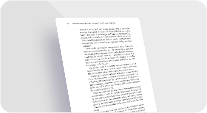 152 Personal Content Experience: Managing Digital Life in the Mobile Age timestamps are updated, and perhaps also the ratings or some other metadata is modifi ed. If metadata is embedded inside the content binary, that binary is also changed and fl agged as needing backup. Consequently, the whole binary fi le is transferred in the backup process. When metadata is stored in the database, only the modifi ed metadata rows in a table need to be backed up, making the whole process faster and easier. There are also some negative consequences to using a database. In particular, separating metadata from the content objects it describes may result in them getting out of synchronization. Consider, for instance, transferring the latest hit movie from Eddie’s loot to the home PC in order to watch it in your home theatre. What happens to metadata that is stored in the database in your mobile device? Can you move the metadata to the PC, too? One solution could be embedding whatever metadata there is in the database into the movie fi le upon transfer. However, some meta- data, such as relationships, are hard if not impossible to embed. Another option is to export the metadata into a separate metadata fi le (a metadata manifest, see section 5.5), and then also transfer it to a PC along with the content object. In this case, even though all meta- data is transferred, relationships to other content objects in the mobile device may still be broken and, obviously, a PC needs to understand the exported metadata format. Other synchronization problems become evident when you modify some metadata in the PC. For example, the play count of a song should be increased no matter where or how you watch the movie. Another likely scenario is that new metadata is added, and existing metadata updated, due to the easier text input methods that the PC provides. Of course, this new metadata needs to be moved back to the mobile device. Worse problems arise if the metadata in the mobile device is modi- fi ed while it is also being altered in the PC. A typical case is listening to the same song in a PC and a mobile device, when the play count needs to be updated both ways. Solving the metadata synchronization is a diffi cult problem, and there is no automatic solution that is capable of performing fl awlessly in all possible cases. There are always situa- tions where the user needs to choose how to merge confl icting meta- data or should some metadata be discarded. However, synchronization is such a common problem that many functional solutions exist, for example, OMA SyncML13 and other protocols that are designed espe- cially for such problems. 13 http://www.openmobilealliance.org/tech/wg_committees/ds.html