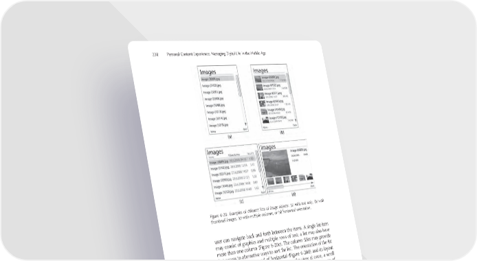 238 Personal Content Experience: Managing Digital Life in the Mobile Age Figure 6-20. Examples of different lists of image objects: (a) with text only, (b) with thumbnail images, (c) with multiple columns, or (d) horizontal orientation. user can navigate back and forth between the items. A single list item may consist of graphics and multiple rows of text; a list may also have more than one column (Figure 6-20c). The column titles may provide fast access to alternative ways to sort the list. The orientation of the list is typically vertical instead of horizontal (Figure 6-20d) and its layout may vary. If all the list items do not fi t into the view at once, a scroll bar is used to indicate the location of the currently visible range of objects. All lists in Figure 6-20 use the same resolution and font size. What is the best presentation depends on the user’s task. For example, the plain list (top-left) presents the largest number of items; the list at the top-right shows more details and a small preview; bottom-left offers a quick way to scan details and change the sort order; and the list in bottom-right shows a large preview of the currently highlighted item. A special case for presenting a list is a dropdown list that requires little screen space, as only the currently selected item is presented. If