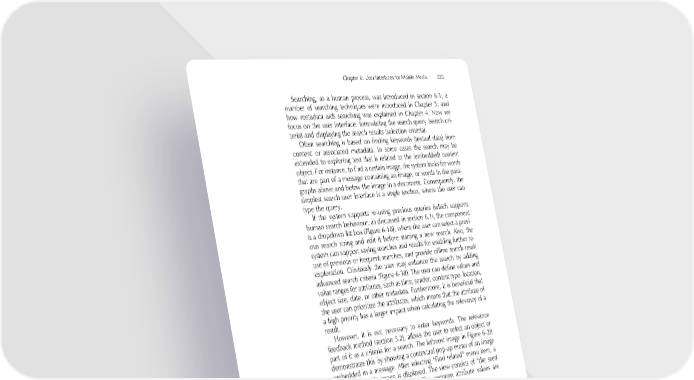Chapter 6: User Interfaces for Mobile Media 255 Searching, as a human process, was introduced in section 6.1; a number of searching techniques were introduced in Chapter 5; and how metadata aids searching was explained in Chapter 4. Now we focus on the user interface: formulating the search query (search cri- teria) and displaying the search results (selection criteria). Often searching is based on fi nding keywords (textual data) from content or associated metadata. In some cases the search may be extended to exploring text that is related to the (embedded) content object. For instance, to fi nd a certain image, the system looks for words that are part of a message containing an image, or words in the para- graphs above and below the image in a document. Consequently, the simplest search user interface is a single textbox, where the user can type the query. If the system supports re-using previous queries (which supports human search behaviour, as discussed in section 6.1), the component is a dropdown list box (Figure 6-18), where the user can select a previ- ous search string and edit it before starting a new search. Also, the system can support saving searches and results for enabling further re- use of previous or frequent searches, and provide offl ine search result exploration. Obviously the user may enhance the search by adding advanced search criteria (Figure 6-18). The user can defi ne values and value ranges for attributes, such as time, sender, content type, location, object size, date, or other metadata. Furthermore, it is benefi cial that the user can prioritize the attributes, which means that the attribute of a high priority has a larger impact when calculating the relevancy of a result. However, it is not necessary to enter keywords. The relevance feedback method (section 5.2), allows the user to select an object or part of it as a criteria for a search. The leftmost image in Figure 6-28 demonstrates this by showing a contextual pop-up menu of an image embedded in a message. After selecting “Find related” menu item, a view on the right image is displayed. The view consists of “the seed image” and list of related items. The common attribute values are bolded in under the seed image. Instead of fi nding related information, another option would be to search for similar content. This differs from the previous method in such a way that the objects do not have any relations between them; instead they should contain similar features. These kinds of searching will become even more powerful as technologies for recognizing fea- tures (such as human faces in an image, video footage shot outdoors, or recognizing the song genre automatically) of the non-textual content evolve, thus introducing new search attributes.