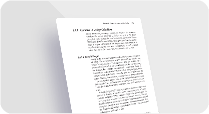 Chapter 6: User Interfaces for Mobile Media 243 6.4.1 Common UI Design Guidelines Before introducing the design process, we review a few important principles that should affect the UI design. A myriad of “UI design principles” exists; perhaps the most famous ones are those by Nielsen (1994) and Shneiderman (1998). These principles form the corner- stone of a good UI in general, but they are even more important in mobile devices, as the users have no opportunity to read a manual when they are on the move. Next, we summarize our UI rules. 6.4.1.1 Keep It Simple! Among all the important design principles, simplicity is the one above all others. Use common sense and try and avoid any complex and “exotic” design solutions. To exaggerate a little, the world is full of wonderful inventions that are too diffi cult to use, for everyone except the designer. Fancy designs often demand a lot of labour during dif- ferent phases in the product lifecycle: when being designed, imple- mented, tested, and – fi nally – when the users start to learn to use the system. There is, in most cases, no comparison to the gained benefi t. Instead, the best way to create usable user interfaces is to compare different solutions – traditional and radical, improve, innovate, test and iterate the design, listen to the users’ voice, and – use loads of common sense. A simple design should make it predictable what can be done now or what to do next, as the actions form a logical sequence with clear start and end points. When things are visible in the user interface, the user’s cognitive and short-term memory load are reduced. The user should not have to remember what was on the previous screen; instead the system should provide the necessary information and cues. Also, the design should contain aspects that are familiar to the user as well as being easy and quick to learn. 6.4.1.2 User Controls Everything! Users – especially those with a lot of experience – wish to feel in control. Therefore, the system should provide timely feedback on the user’s actions, so that they know what they are related to. For frequent actions, feedback should not disturb the task fl ow. A rule of thumb is that feedback is considered instant if the system has provided a response within 0.1 seconds. One second is considered to be the limit for the user’s fl ow of thoughts to remain undisturbed, even though the user will notice a delay of such a length. Beyond this, the system should provide some indication about the delay and ten seconds is the maximum to keep