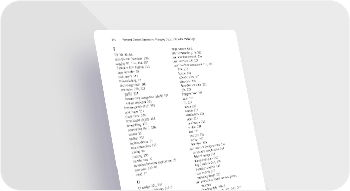 356 Personal Content Experience: Managing Digital Life in the Mobile Age T usage pattern 64–5 T9 30, 46, 66 user centred design 6, 205 tabs (in user interface) 226 user interface controls 234 tagging 83, 104, 141, 301 user interface (UI) 201 Tampere Film Festival 212 user interface component 216, 234 tape recorder 39 time 232 task, user’s 111 button 234 task-switching 22 calendar view 241 technology push 200 checkbox 236 text entry 220, 221 drop-down textbox 235 graffi ti 221 grid 239 handwriting recognition (HWR) 221 image or icon 231 virtual keyboard 221 label 231 Text-to-speech (TTS) 219 list 237 ticker tape 231 menu 237 tilted plane 228 palette 237 time-based objects 168 radiobutton 236 timeshifting 120 slider 234 timeshifting life 9, 338 spin button 236 toaster 33 symbol 231 toolbar 237 text 231 toolbox device 21 text box 236 total conversion 313 toolbar 237 tracing 94 tree view 239 tracking 295 user interface design process 247 transfer rate 37 component specifi cation 251 transition between applications 99 detailed design 251 tree view 239–40 dialogue diagram 250 trend 47 key questions 248, 249 U operation analysis 247 task analysis 247 UI design 201, 247 validating design 253 UI design guidelines 243–6 user interface structure see navigation, UI design process 247 structure UI view 97 user interface style 246–7 UIQ 227, 247, 279, 289 user interface style guide 227, 243, 247 UKMARC 101 user interface, evolution 201 undo 135 user interface, highlighting a component 233 UNIMARC 101 user pull 200 Universal Plug and Play (UPnP) 29, 121, User-centered Design (UCD) 205 151, 157 user-centered design methods 205, 206 Universal Resource Identifi er (URI) 102, UWB 36 161, 167, 179, 188 usability 252–3 V usage event 147 vehicle 19 usage history 141 version control 134