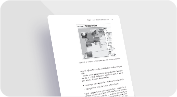 Chapter 6: User Interfaces for Mobile Media 265 Figure 6-32. An example of multimedia presentation made with auto-summarization. captured right on the spot that would facilitate visual searching and recall. Another form of getting content is ripping, which has a bad reputa- tion due to its illegal distribution of commercial content via peer-to- peer networks. Ripping is characterized as: • converting or extracting data from one format to another; and/or • copying physical media that is more useful to the user. Typical examples include converting audio from a compact disc to MP3 fi les, or scenes from a DVD to MPEG4 fi les. The actual conversion process is straightforward from the UI perspective, not requiring any fancy controls. Since the task involves drives for physical media as well as lots of processing power and memory for transcoding, it is often done with desktop computers. There is a form of ripping that requires more user involvement and aids from the system. This is related to, for instance, capturing images and text snippets from documents (such as WWW pages) and inserting them into other documents that are in a more convenient format (such as ASCII text). This kind of ripping requires the system to support clipboard functions (copy and paste). Finally, getting new content leads always – immediately or later – to other phases of GEMS. An example of these tasks could be capturing