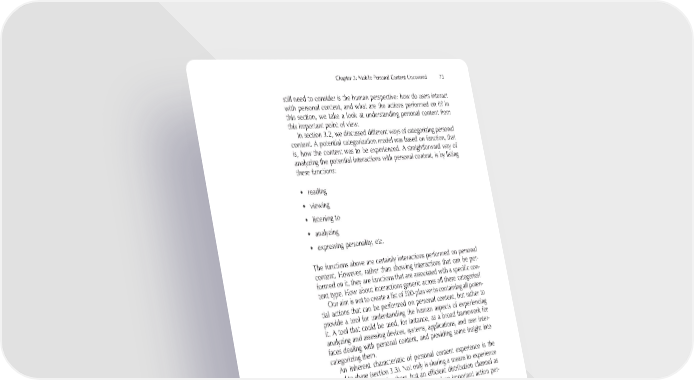 Chapter 3: Mobile Personal Content Uncovered 73 still need to consider is the human perspective: how do users interact with personal content, and what are the actions performed on it? In this section, we take a look at understanding personal content from this important point of view. In section 3.2, we discussed different ways of categorizing personal content. A potential categorization model was based on function, that is, how the content was to be experienced. A straightforward way of analyzing the potential interactions with personal content, is by listing these functions: • reading • viewing • listening to • analyzing • expressing personality, etc. The functions above are certainly interactions performed on personal content. However, rather than showing interactions that can be per- formed on it, they are functions that are associated with a specifi c con - tent type. How about interactions generic across all these categories? Our aim is not to create a list of 500-plus verbs containing all poten- tial actions that can be performed on personal content, but rather to provide a tool for understanding the human aspects of experiencing it. A tool that could be used, for instance, as a broad framework for analyzing and assessing devices, systems, applications, and user inter- faces dealing with personal content, and providing some insight into categorizing them. An inherent characteristic of personal content experience is the need to share (section 3.3). Not only is sharing a means to experience personal content with others, but an effi cient distribution channel as well. Therefore, sharing can be considered an important action per- formed on personal content. Before any piece of content can be shared, it must have been retrieved from somewhere. Thinking about inputs and outputs logically leads us to a lifecycle-like model, where content comes from a source, and at least some of it leaves in one way or another. Perhaps we could consider these two aspects in more detail: 1. Incoming content: downloading, receiving, capturing, trading, etc.; 2. Outgoing content: selling, sending, pushing, publishing, etc.