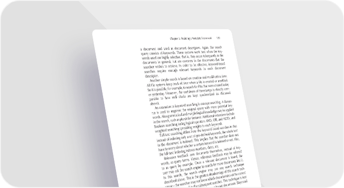 Chapter 5: Realizing a Metadata Framework 139 a document and used as document descriptors. Again, the search query consists of keywords. These systems work best when the key- words used are highly selective, that is, they occur infrequently in the documents in general, but are common in the documents that the searcher wishes to retrieve. In order to be effective, keyword-based searches require enough relevant keywords in each document descriptor. Another simple search is based on creation and modifi cation time. All fi le systems keep track of time when a fi le is created or modifi ed. So it is possible, for example, to search for fi les that were created today or yesterday. However, the usefulness of timestamps is directly com- parable to how well clocks are kept synchronized (as discussed above). An extension to keyword searching is concept searching. A thesau- rus is used to augment the original query with more potential key- words. Also grammatical and morphological knowledge may be applied in the search, such as plurals for instance. Additional extensions include Boolean searching (using logical operators AND, OR, and NOT); and weighted searching (providing weights to each keyword). Full-text searching differs from the keyword-based searches in that instead of indexing only a set of pre-defi ned keywords, the whole text in the document is indexed. This implies that the searcher does not have to worry about whether a certain keyword is indexed or not. Also, the full-text indexing indexes numbers, dates, etc. Relevance feedback uses documents themselves, instead of key- words, as query terms. Hence, relevance feedback may be referred to as query by example. Once a relevant document is found, the user may ask the search engine to search for more documents like it. In this search, the search engine may use any search technique described above. This is the greatest disadvantage of this search tech- nique – the searcher may not know which characteristics of the current document are used in the subsequent searches. This technique is best when the user is unable to fi nd more relevant documents (Raymond 1998). The discussion above concerns only textual information. How, then, should one search for content items that are stored in binary formats, such as music and photos? The content itself should in one way or another be used in searching. Searching for features in multimedia fi les is referred to as content- based retrieval (CBR) (Hirata and Kato 1992; Tseng 1999). In CBR, the idea is to analyse the content, for instance identifying shapes in a photo or rhythm in a song. These features can then be searched for, either by providing examples of the patterns or features that are