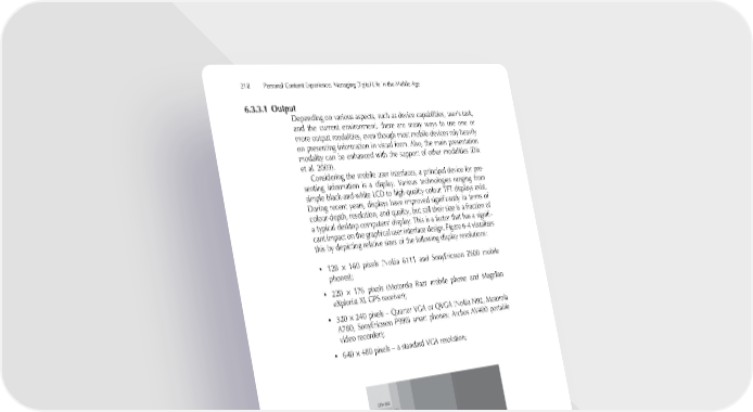 218 Personal Content Experience: Managing Digital Life in the Mobile Age 6.3.3.1 Output Depending on various aspects, such as device capabilities, user’s task, and the current environment, there are many ways to use one or more output modalities, even though most mobile devices rely heavily on presenting information in visual form. Also, the main presentation modality can be enhanced with the support of other modalities (Dix et al. 2003). Considering the mobile user interfaces, a principal device for pre- senting information is a display. Various technologies ranging from simple black-and-white LCD to high-quality colour TFT displays exist. During recent years, displays have improved signifi cantly in terms of colour-depth, resolution, and quality, but still their size is a fraction of a typical desktop computers’ display. This is a factor that has a signifi - cant impact on the graphical user interface design. Figure 6-4 visualizes this by depicting relative sizes of the following display resolutions: • 128 × 160 pixels (Nokia 6111 and SonyEricsson Z600 mobile phones); • 220 × 176 pixels (Motorola Razr mobile phone and Magellan eXplorist XL GPS receiver); • 320 × 240 pixels – Quarter VGA or QVGA (Nokia N92, Motorola A780, SonyEricsson P990i smart phones; Archos AV400 portable video recorder); • 640 × 480 pixels – a standard VGA resolution; Figure 6-4. Relative screen sizes of display resolutions used in various mobile devices.