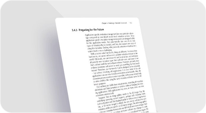 Chapter 5: Realizing a Metadata Framework 153 5.4.3 Preparing for the Future Application-specifi c metadata management has one particular advan- tage compared to centralized system-level metadata services. Since application-specifi c metadata management systems are designed solely for the application needs, they automatically take care of any new types of metadata that is needed, and they also support new ways of using this metadata. Dealing with previously unknown metadata on a system level is more challenging. With a system-wide framework, things are different. No matter how hard we try, we cannot defi ne every possible metadata attribute in the world. Obviously, we can forever try and be proactive, and anticipate all possible new metadata types there will ever exist, and ways to use them, at least until the next software release. However, probably most of these inventions will never be used, just overfi lling the framework instead. Therefore, our framework must be designed to be extensible – but without breaking old applications. It is even better if the old applications can use new metadata extensions automatically. Also, the extension process must be as easy as possible, without any central body to solve confl icts like using the same metadata attribute name for dif- ferent purposes. Our architecture fulfi ls these requirements, extending all metadata defi nitions and their semantics at runtime, without changing the exist- ing applications. Old applications may even, in many cases, use new extensions automatically. Suppose that an image gallery needs to list all images that the underlying operating system supports, perhaps with metadata fi elds such as location and title displayed under it. When a new image format (say, a 3D stereo image) is added, the new format will have its own metadata attributes specifi c to 3D stereo images. The old image gallery using our metadata framework can still fi nd all new stereo images, their location, and title metadata attributes without any changes in code. This is because 3D stereo images are more specialized than regular 2D images, and share many common attributes besides introducing new ones. However, the image gallery does not know anything about the new attributes or what they mean, and probably will not access them, as it is unaware of their existence. How this can be achieved is described later in section 5.7. Obviously, for every positive feature there is some cost to pay. One of the most signifi cant costs our framework has is due to its nature of being as fl exible as possible. In order to support every possible meta- data and application, it cannot be optimized for any single application. A single application using its own optimized metadata management