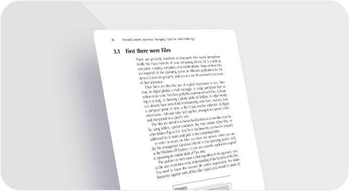 48 Personal Content Experience: Managing Digital Life in the Mobile Age 3.1 First there were Files There are probably hundreds of thousands fi les stored somewhere inside the mass memory of your computing device, be it a desktop computer, a laptop computer, or a mobile phone. Many of these fi les are required by the operating system or different applications for the device to function properly, and you as a user do not need to be aware of their existence. Then there are fi les that are of explicit importance to you. They may be digital photos, e-mail messages, or songs purchased from an online music store. You have probably experienced such fi les, by listen- ing to a song, or shooting a photo while on holiday. In other words, you already have some kind of relationship with them. And yet, from a computer point of view, a fi le is just another collection of digital information – bits and bytes tied together, arranged in a specifi c order, and interpreted in a specifi c way. The fi les are stored in a hierarchical fashion in a tree-like structure by using folders, special containers that may contain either fi les, or other folders (Figure 3-2). Any fi le in the hierarchy can then be uniquely addressed by its name and path to the containing folder. In order to access the fi les, you have two options: either you use the fi le management functions offered by the operating system, such as the Windows XP Explorer, or you use a specifi c application targeted at operating on certain kinds of fi les only. The problem in both cases is that regardless of the approach, you, as the user, must have some understanding of the location of the fi les. You need to know the internal fi le system organization (the folder hierarchy) together with all the other aspects you should be aware of, Figure 3-2. A schematic presentation of a fi le manager.