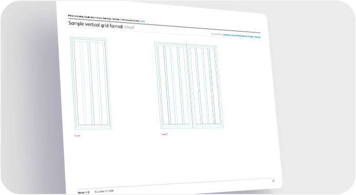 56 Version 1.2 December 11, 2009 Spread Pfizer Branding Guidelines / Visual i dentity / section 1: the masterbrand / Grids Sample vertical grid format small Cover General users c ommunications Professionals design agencies