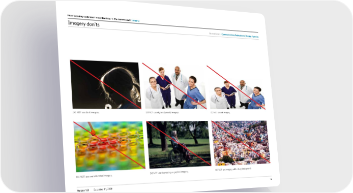 42 Version 1.2 December 11, 2009 Imagery don’ts Pfizer Branding Guidelines / Visual i dentity / 1. the masterbrand / imagery DO NOT use dark imagery. DO NOT use oversaturated imagery. DO NOT use depressing or graphic imagery. DO NOT use imagery with a busy background. DO NOT use stylized (posed) imagery. DO NOT distort imagery. General users c ommunications Professionals design agencies