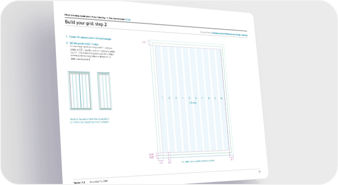 53 Version 1.2 December 11, 2009 Build your grid: step 2 Pfizer Branding Guidelines / Visual i dentity / 1. the masterbrand / Grids General users c ommunications Professionals design agencies 0.2" 0.25" 0.25" 0.5" 0.5" 0.5" 1 2 3 4 5 6 7 Columns 8 9 10 1. create 10 columns within the text margin. 2. set the gutter to 0.2" inches. For an image and text margin of 0.5", set your gutter at 0.2" . Use this ratio of margins to gutter size (1 : 4) to determine gutter sizes for printed communications larger than a standard U.S. letter size document. Grids for layouts smaller than a standard U.S. letter size should use 6 or 3 columns. U.S. letter size is used for sample purposes.