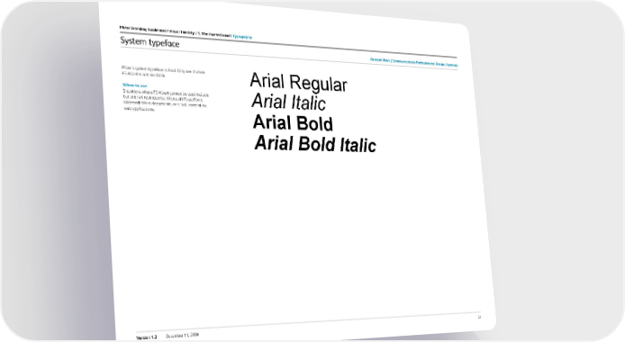 51 Version 1.2 December 11, 2009 Pfizer Branding Guidelines / Visual i dentity / 1. the masterbrand / t ypography System typeface Pfizer’s system typeface is Arial. Only use it when FS Albert is not available. When to use Situations where FS Albert cannot be used include but are not restricted to: Microsoft PowerPoint, Microsoft Word documents, or HTML content on web applications. Arial Regular Arial Italic Arial Bold Arial Bold Italic General users c ommunications Professionals design agencies