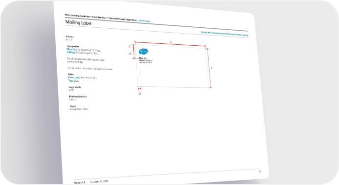 77 Version 1.2 December 11, 2009 f ormat 6” x 3” t ypography Pfizer inc: FS Albert Bold 10/11 pts. address: FS Albert Light 9/11 pts. Set all text u&lc, flush left, ragged right, normal tracking Use two letter, all capital abbreviations for states c olor Pfizer logo: PMS Process Blue t ext: Black logo width: 0.75” Printing method: Offset Paper: Bright White 100lb Mailing Label Pfizer Branding Guidelines / Visual i dentity / 1. the masterbrand / applications / office system General users c ommunications Professionals design agencies Pfizer Inc 235 E ast 42nd Street New York, NY 10017 .25” .25” .75” 6” 3”