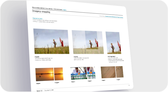 40 Version 1.2 December 11, 2009 Imagery: cropping Pfizer Branding Guidelines / Visual i dentity / 1. the masterbrand / imagery crop appropriately A communications piece will have more impact when an image is appropriately scaled and cropped. original Start with an appropriate foreground, midground, or background image. cropping Select an area that is an appropriate size for your document. original cropped original cropped original cropped f inal image should • Focus on a single subject • Be free of clutter (distracting shapes) • Provide ample clear space for typography and graphic elements General users c ommunications Professionals design agencies
