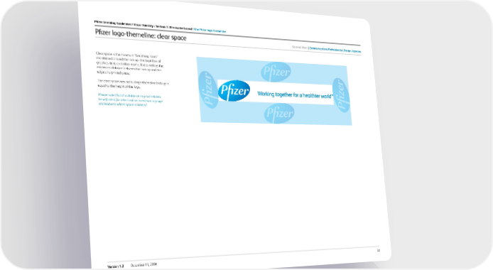 30 Version 1.2 December 11, 2009 Pfizer logo-themeline: clear space Pfizer Branding Guidelines / Visual i dentity / section 1: the masterbrand / the Pfizer logo-themeline Clear space is the minimum “breathing room” maintained around the lock-up. It is kept free of graphics, text, and other marks. It also defines the minimum distance between the lock-up and the edge of a printed piece. The clear space around our logo-themeline lock-up is equal to the height of the logo. Please note that this distance may sometimes be adjusted for select online or exterior signage applications where space is limited. General users c ommunications Professionals design agencies