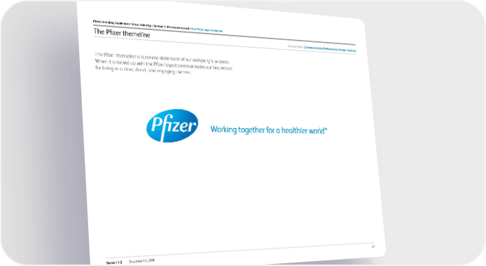27 Version 1.2 December 11, 2009 The Pfizer themeline The Pfizer themeline is a concise statement of our company’s purpose. When it is locked up with the Pfizer logo it communicates our key reason for being in a clear, direct, and engaging manner. Pfizer Branding Guidelines / Visual i dentity / section 1: the masterbrand / the Pfizer logo-themeline General users c ommunications Professionals design agencies