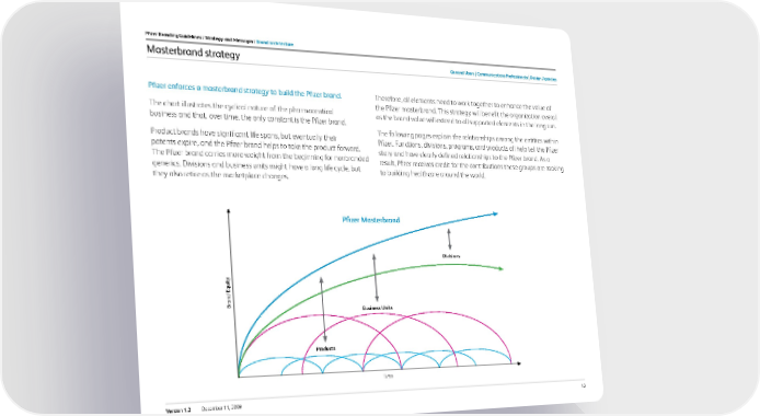 12 Version 1.2 December 11, 2009 Pfizer enforces a masterbrand strategy to build the Pfizer brand. The chart illustrates the cyclical nature of the pharmaceutical business and that, over time, the only constant is the Pfizer brand. Product brands have significant life spans, but eventually their patents expire, and the Pfizer brand helps to take the product forward. The Pfizer brand carries more weight from the beginning for nonbranded generics. Divisions and business units might have a long life cycle, but they also retire as the marketplace changes. Therefore, all elements need to work together to enhance the value of the Pfizer masterbrand. This strategy will benefit the organization overall as the brand value will extend to all supported elements in the long run. The following pages explain the relationships among the entities within Pfizer. Functions, divisions, programs, and products all help tell the Pfizer story and have clearly defined relationships to the Pfizer brand. As a result, Pfizer receives credit for the contributions these groups are making to building healthcare around the world. Masterbrand strategy Pfizer Branding Guidelines / strategy and messagin / Brand architecture Brand Equity Pfizer m aster brand d ivisions Time Products Business u nits General users c ommunications Professionals design agencies