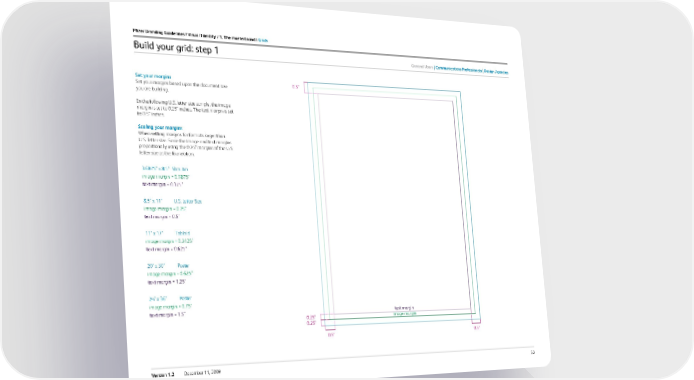 52 Version 1.2 December 11, 2009 Build your grid: step 1 Pfizer Branding Guidelines / Visual i dentity / 1. the masterbrand / Grids General users c ommunications Professionals design agencies 0.25" 0.25" 0.5" 0.5" 0.5" image margin text margin set your margins Set your margins based upon the document size you are building. In the following U.S. letter size sample, the image margin is set to 0.25" inches. The text margin is set to 0.5" inches. scaling your margins When setting margins for formats larger than U.S. letter size. Scale the image and text margins proportionally using the 0.25” margins of the U.S. letter size as the foundation. image margin = 0.25" text margin = 0.5" 8.5" x 11" U.S. Letter Size image margin = 0.3125" text margin = 0.625" 11" x 17" Tabloid image margin = 0.625" text margin = 1.25" 20" x 30" Poster image margin = 0.75" text margin = 1.5" 24" x 36" Poster image margin = 0.1875" text margin = 0.375" 3.6875" x 8.5" Slim Jim