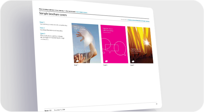 68 Version 1.2 December 11, 2009 Opportunities to Build Partnerships New acquisitions for a healthier world Opportunities to Build Partnerships New acquisitions for a healthier world Opportunities to Build Partnerships New acquisitions for a healthier world Discovery c over 1 Type and image combine to tell a complete story. c over 2 Use dotted illustration to enhance story. c over 3 PDot display type is used to emphasize the message communicated by the image and headline. Sample brochure covers Pfizer Branding Guidelines / Visual i dentity / 1. the masterbrand / how to build a layout Cover 1 Cover 2 Cover 3 General users c ommunications Professionals design agencies