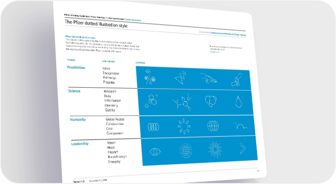 43 Version 1.2 December 11, 2009 Possibilities science humanity leadership themes su B- themes exam P les The Pfizer dotted illustration style Pfizer Branding Guidelines / Visual i dentity / 1. the masterbrand / dotted illustration Ideas Imagination Pathways Progress Research Data Information Discovery Quality Global Access Collaboration Care Compassion Vision Hope Impact Breakthrough Integrity Pfizer dotted illustration style The subject matter captured by the illustrations brings the concepts within Our Path Forward to life. The illustrations are divided into themes that elevate and support messaging to help tell an overall story. The dotted illustration style conveys the aspirational qualities within Pfizer’s purpose and mission. Illustrations can be found in the Pfizer dotted illustration library at: id.pfizer.com General users c ommunications Professionals design agencies