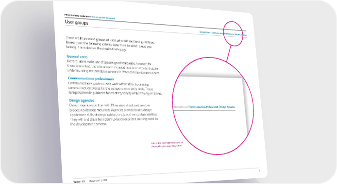 5 Version 1.2 December 11, 2009 Pfizer Branding Guidelines / how to use this document User groups There are three main groups of users who will use these guidelines. Based upon the following criteria, determine to which group you belong. Then observe those rules that apply: General users General users make use of predesigned templates; however, for those interested, the information included here is an excellent aid to understanding the principles at work in Pfizer communications pieces. c ommunications professionals Communications professionals work within Pfizer to develop communication pieces for the company on a daily basis. These samples provide guidance for creating variety while staying on-brand. design agencies Design agencies partner with Pfizer via a structured creative process to develop materials. Agencies provide expert design application skills, strategic advice, and broad conceptual abilities. They will find this information to be an excellent starting point for the development process. Gener al Users C ommunic ations P r of essionals Design Agencies Refer to the upper right hand corner of the page for your group designation. General users c ommunications Professionals design agencies