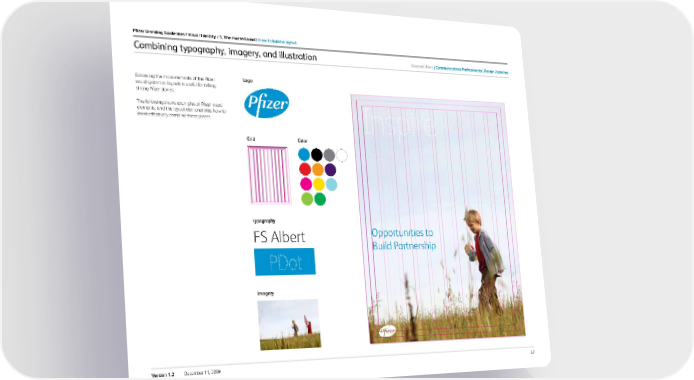 67 Version 1.2 December 11, 2009 Combining typography, imagery, and illustration Balancing the main elements of the Pfizer visual system in layouts is useful for telling strong Pfizer stories. The following shows examples of Pfizer visual elements, and the layout demonstrates how to most effectively combine these pieces. Inspire Opportunities to Build Partnership imagery t ypography FS Albert PDot logo Grid c olor Pfizer Branding Guidelines / Visual i dentity / 1. the masterbrand / how to build a layout General users c ommunications Professionals design agencies