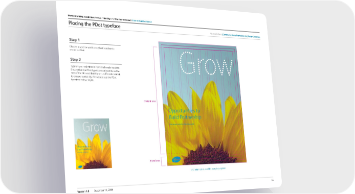 65 Version 1.2 December 11, 2009 Placing the PDot typeface Content area Brand area Opportunities to Build Partnership New acquisitions for a healthier world Opportunities to Build Partnership New acquisitions for a healthier world Pfizer Branding Guidelines / Visual i dentity / 1. the masterbrand / how to build a layout step 1 Choose a word or words or a short headline to render in PDot. step 2 Typeset your selection in PDot and render in white. Ensure that the PDot typeface is at least twice the size of the title and that there is sufficient contrast to ensure readability. Do not use size the PDot typeface below 36 pts. U.S. letter size is used for sample purposes. Content area Brand area Opportunities to Build Partnership New acquisitions for a healthier world Opportunities to Build Partnership New acquisitions for a healthier world General users c ommunications Professionals design agencies