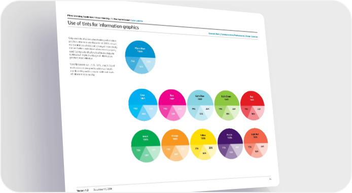 34 Version 1.2 December 11, 2009 Use of tints for information graphics Pfizer Branding Guidelines / Visual i dentity / 1. the masterbrand / c olor palette General users c ommunications Professionals design agencies Only use tints of colors when treating information graphics, otherwise use the color at 100%. Visual representations of data are conveyed more clearly and are better understood when color is properly used. Using pairs of colors that have adequate contrast will make the design of information graphics more effective. Specific screens (i.e., 75%, 50%, and 25%) of each color are designed to add visual depth and flexibility and to convey additional levels of information hierarchy. 50% 75% 25% Pfizer Blue 100% Pink 100% 50% 75% 25% light Blue 100% 50% 75% 25% 50% 75% 25% c yan 100% light Green 100% 50% 75% 25% r ed 100% 50% 75% 25% orange 100% 50% 75% 25% y ellow 100% 50% 75% 25% 50% 75% 25% Green 100% Purple 100% 50% 75% 25% light r ed 100% 50% 75% 25%