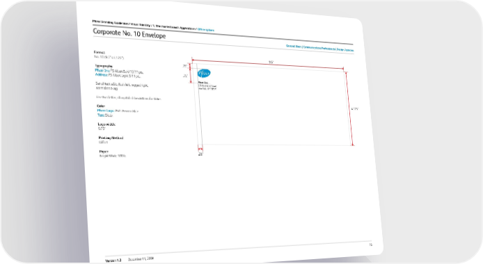 75 Version 1.2 December 11, 2009 f ormat No. 10 (9.5” x 4.125”) t ypography Pfizer inc: FS Albert Bold 10/11 pts. address: FS Albert Light 9/11 pts. Set all text u&lc, flush left, ragged right, normal tracking Use two letter, all capital abbreviations for states c olor Pfizer logo: PMS Process Blue t ext: Black logo width: 0.75” Printing method Offset Paper Bright White 100lb General users c ommunications Professionals design agencies Pfizer Branding Guidelines / Visual i dentity / 1. the masterbrand / applications / office system Corporate No. 10 Envelope Pfizer Inc 235 E ast 42nd Street New York, NY 10017 9.5” .25” 4.125” .25” .75”