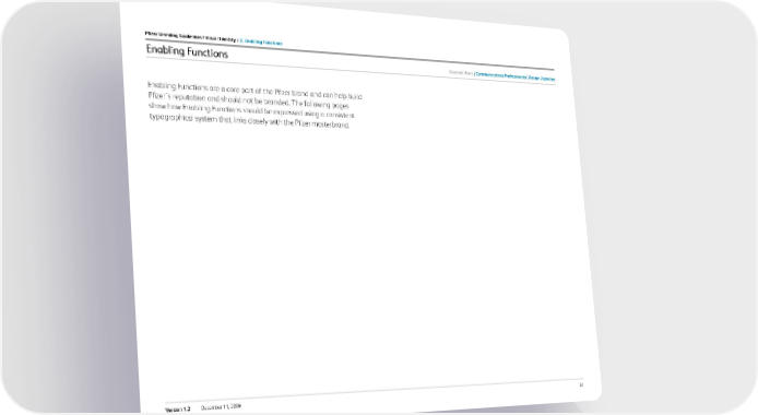 81 Version 1.2 December 11, 2009 Enabling Functions Enabling Functions are a core part of the Pfizer brand and can help build Pfizer’s reputation and should not be branded. The following pages show how Enabling Functions should be expressed using a consistent typographical system that links closely with the Pfizer masterbrand. Pfizer Branding Guidelines / Visual i dentity / 2. enabling f unctions General users c ommunications Professionals design agencies