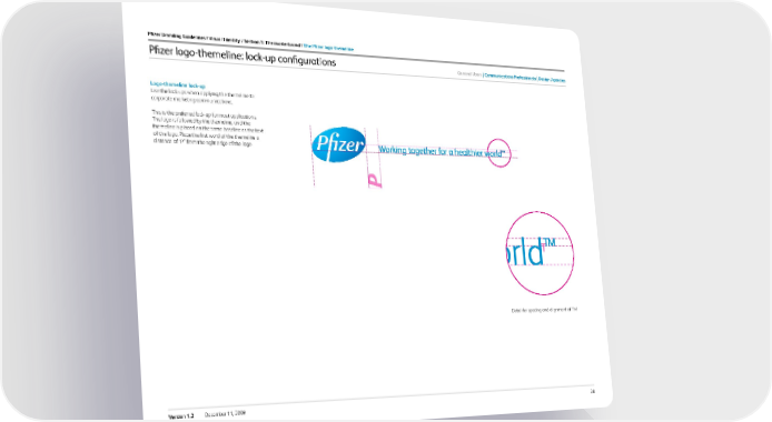 28 Version 1.2 December 11, 2009 logo-themeline lock-up Use the lock-ups when applying the themeline to corporate marketing communications. This is the preferred lock-up for most applications. The logo is followed by the themeline, and the themeline is placed on the same baseline as the text of the logo. Place the first word of the themeline a distance of āPā from the right edge of the logo. Pfizer logo-themeline: lock-up configurations Pfizer Branding Guidelines / Visual i dentity / section 1: the masterbrand / the Pfizer logo-themeline Detail for spacing and alignment of TM General users c ommunications Professionals design agencies