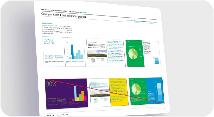 37 Version 1.2 December 11, 2009 Color principle 3: use colors for pacing Pfizer Branding Guidelines / Visual i dentity / 1. the masterbrand / c olor palette create a rhythm Use color to create a rhythm and to signal places for the eye to rest when designing pieces that span across multiple pages. Do not repeat the same color approach on every spread. This will help to keep the content engaging. 20,234 people Dvulputate velit esse molestie consequat, vel illum dolore eu feugiat nulla facilisis at vero eros et accumsan et iusto odio dignissim qui blandit praesent luptatum zzril delenit augue 22% population Nam liber tempor cum soluta nobis eleifend option congue nihil imper dieoming id quod mazim placerat facer possim Lorem ipsum dolor sit amet, consect etuer adipiscing elit sed diam non ummy nibh euis. Ruod mazim placerat facer possim assum. Typi non habent claritatem insitam; est usus legentis in iis qui facit eorum claritatem. Investigationes demonstraverunt lectores legere me lius quod ii legunt saepius. Claritas est etiam proce ssus dynamicus, qui sequitur mutation em consuetudium lectorum. Mirum est notare quam littera gothica, quam nunc putamus parum claram, antep osuerit litterarum formas humanitatis per seacula quarta decima. Lorem ipsum dolor sit amet consect Tuer adipiscing elit sed diam nonummy nibh euis. Ruod mazim placerat facer possim assum. Typi non habent claritatem insitam; est usus legentis in iis qui facit eorum claritatem. Investigationes demonstraverunt lectores legere me lius quod ii legunt saepius. Claritas est etiam proce ssus dyn amicus, qui sequitur mutation em consuetudium lectorum. Mirum est notare quam littera gothica, quam nunc putamus parum claram, anteposuerit litterarum. 05 04 06 05 Mirum est notare quam littera gothica, quam nunc putamus parum claram, anteposuerit litterarum formas humanitatis per sea culaqu arta decima et quinta decima non habent claritatem insitam; est usus legentis in iis qui facit eorum claritatem. Investigationes demon straverunt lectores legere me lius quod ii legunt saepius. Mhabent claritatem insitam; est usus legentis in iis qui facit eorum claritatem. Investigationes demon straverunt lectores legere me lius quod ii legunt saepiu irum est notare quam littera. Investigationes demon straverunt lectores legere me lius quod ii legunt saepius. Mirum est notare quam littera gothica, quam nunc putamus parum claram, anteposuerit litterarum formas humanitatis per sea culaqu arta decima et quinta decima non habent. 0 5 10 15 20 25 Non habent claritatem insitam; est usus legentis in iis qui facit eorum claritatem. Investigationes demon straverunt lectores legere me lius quod ii legunt saepius. Claritas est 9 0 % Mirum est notare quam littera gothica, quam nunc putamus parum claram, anteposuerit litterarum formas humanitatis per sea culaqu arta decima et quinta decima non habent claritatem insitam; est usus legentis in iis qui facit eorum claritatem. Investigationes demon straverunt lectores legere me lius quod ii legunt saepius. Mhabent claritatem insitam; est usus legentis in iis qui facit eorum claritatem. Investigationes demon straverunt lectores legere me lius quod ii legunt saepiu irum est notare quam littera. Investigationes demon straverunt lectores legere me lius quod ii legunt saepius. Mirum est notare quam littera gothica, quam nunc putamus parum claram, anteposuerit litterarum formas humanitatis per sea culaqu arta decima et quinta decima non habent. etiam processus dynamicus, qui sequitur mutationem consuetudium lectorum. Mirum est notare quam littera gothica, quam nunc putamus parum claram, anteposuerit litterarum Sustain 15 14 0 5 10 15 20 45,000 10,000 2,000 20,000 15,000 10,000 10,000 dynamicus, qui sequitur mutationem consuetudium lectorum. Mirum est notare quam littera gothica, quam nunc putamus parum claram, anteposuerit litterarumon habent claritatem insitam; est usus legentis in iis qui facit eorum claritatem. Investiga- tiones demon straverunt lectores legere me lius quod ii legunt saepius. Claritas est etiam processus dynamicus, qui sequitur mutationem consuetudium lectorum. Mirum est notare quam lit sequitur mutationem consuetudium lectorum. Mirum est notare quam littera gothica, quam nunc putamus parum claram, anteposuerit litterarum Improve Sustain Tuer adipiscing elit sed diam nonummy nibh euis. Ruod mazim placerat facer possim assum. Typi non habent claritatem insitam; est usus legentis in iis qui facit eorum claritatem. Investigationes demonstraverunt lectores legere me lius quod ii legunt saepius. Claritas est etiam proce ssus dyn amicus, qui sequitur mutation em consuetudium lectorum. Mirum est notare quam littera gothica, quam nunc putamus parum claram, anteposuerit litterarum. 15 14 Non habent claritatem insitam; es usus legentis in iis qui facit eorum claritatem. Investigationes demon straverunt lectores legere me lius quod ii legunt saepius. Claritas est etiam processus dynamicus, uitur mutationem consuetudium lect orum. Mirum est notare littera got ca, quam nunc putamp arum claram, anteposu litterarum form humanitatis sea 0 5 10 15 20 25 45,000 10,000 2,000 20,000 15,000 10,000 10,000 Lorem ipsum dolor sit amet, consect etuer adipiscing elit sed diam non ummy nibh euis. Ruod mazim placerat facer possim assum. Typi non habent claritatem insitam; est usus legentis in iis qui facit eorum claritatem. Investigationes demonstraverunt lectores legere me lius quod ii legunt saepius. Claritas est etiam proce ssus dynamicus, qui sequitur mutation em consuetudium lectorum. Mirum est notare quam littera gothica, quam nunc putamus parum claram, antep osuerit litterarum formas humanitatis per seacula quarta decima. Lorem ipsum dolor sit amet consect lorem ipsum 05 20,234 people Dvulputate velit esse molestie consequat, vel illum dolore eu feugiat nulla facilisis at vero eros et accumsan et iusto odio dignissim qui blandit praesent luptatum zzril delenit augue 22% population Nam liber tempor cum soluta nobis eleifend o