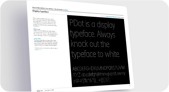 49 Version 1.2 December 11, 2009 Pfizer Branding Guidelines / Visual i dentity / 1. the masterbrand / t ypography Display typeface PDot is a display font designed exclusively for Pfizer. PDot is derived from the dotted illustration style of the Pfizer visual system and can be used in combination with FS Albert. PDot helps to create a unique look and proprietary narrative feel for the Pfizer brand. When to use Only use PDot in sentence case and for display purposes at a type size no smaller than 36pts and for short headlines. Always use the PDot typeface to knock out to white, and never color the typeface. usage rights Pfizer retains the exclusive rights to PDot. When sharing the font with external agencies, colleagues should have written agreements that prevent the usage of the font for projects other than Pfizer’s. The font can be downloaded from the Intranet at: (id.pfizer.com) PDot is a display typeface. Always knock out the typeface to white. ABCDEFGHIJKLMNOPQRSTUVW XYZ abcdefghijklmnopqrstuvwxy z!@#$%^&*()_+{}[]|\?.,;’ General users c ommunications Professionals design agencies