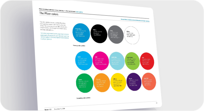 33 Version 1.2 December 11, 2009 Pfizer Branding Guidelines / Visual i dentity / 1. the masterbrand / c olor palette The Pfizer colors General users c ommunications Professionals design agencies The color palette is made up of the Pfizer blue and supportive neutral colors (black, gray, and white). The secondary color palette consists of a complementary set of bright colors that convey boldness and optimism. The colors represented on this page have not been evaluated by Pantone, Inc and may not match the Pantone system. Consult a Pantone Color Formula Guide for reference. Pfizer Blue C100, M10, Y0, K10 R0, G147, B207 Hex #0093D0 PMS Process Blue Black C0, M0, Y0, K100 R0, G0, B0 Hex #000000 White C0, M0, Y0, K0 R255, G255, B255 Hex #FFFFFF secondary color palette Primary color palette Gray C0, M0, Y0, K60 R97, G99, B101 Hex #616365 PMS Cool Gray 10 light Green C50, M0, Y100, K0 R125, G186, B0 Hex #7DBA00 PMS 376C/375U c yan C100, M0, Y0, K0 R0, G174, B238 Hex #00AEEF PMS Process Cyan orange C0, M48, Y100, K0 R248, G151, B29 Hex #F8971D PMS 144C/U y ellow C0, M10, Y100, K0 R247, G212, B23 Hex #F7D417 PMS 109C/108U Pink C0, M100, Y0, K0 R214, G0, B110 Hex #D6006E PMS Process Magenta light Blue C43, M0,Y10, K0 R117, G209, B224 Hex #75D1E0 PMS 310 C/U Green C94, M0, Y100, K0 R0, G169, B79 Hex #00A950 PMS 355C/U Purple C78, M100, Y0, K33 R74, G36, B94 Hex #4A245E PMS 269C/268U r ed C0, M100, Y99, K4 R204, G41, B43 Hex #CC292B PMS 1797C/U light r ed C0, M75, Y75, K0 R242, G102, B73 Hex #F26649 PMS 7417C/U