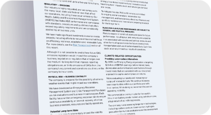 CLIMATE-RELATED RISKS Potential Short- and Medium-term Risks These are risks that may impact financial results. They include any that may materialize over the current annual reporting cycle and up to a five-year time frame. REGULATORY — EMISSIONS Our industry is highly regulated, and we comply with the many local, state and federal laws that affect our operations, including those on air emissions. Our Health, Safety and Environment Management System (HSEMS) facilitates HSE performance and compliance with standards, procedures and guidelines that often exceed regulatory requirements and are consistently applied by all business units. We have made significant investments in environmental projects, including efforts to reduce emissions that focus on efficiency, resilience, adaptation and renewable fuels. For more details, see the Risk Management section of this report. Although it is not possible to predict how future GHG emissions legislation would impact the company’s business, legislation or regulation that emerges over the medium- to long-term that imposes reporting obligations on, or limits emissions of GHGs from, the company's equipment and operations could require the company to incur costs. PHYSICAL RISK — BUSINESS CONTINUITY The company is prepared for the possibility of extreme weather events that might impact our operations. We have developed an Emergency Response Management System and Crisis Management Plan based on risk evaluations and business impact analyses. Each facility has a written emergency response plan to ensure continuous availability, or prompt recovery, of critical business processes, resources and facility operations. Potential Long-term Risks These risks may fundamentally impact the viability of our long-term strategy and business model. They include risks that may materialize over a five- to 10- year time frame. MARKET — OIL AND NATURAL GAS PRICES The deployment of disruptive new technologies at mass scale within government policy environments that strongly incentivize investment and innovation would have long-term impacts on oil and natural gas demand and prices. To mitigate this risk, Phillips 66 remains committed to ongoing scenario analysis, responsible risk management, and transparency about our financial and portfolio resilience and how we are preparing to adapt for the longer term. PLANS FOR OUR FUTURE PERFORMANCE ARE SUBJECT TO SOCIETAL AND POLITICAL PRESSURES Plans to expand or construct assets and plans for future performance, including our joint ventures, are subject to risks associated with societal and political pressures and other forms of opposition to the future development, transportation and use of carbon-based fuels. Such risks could adversely impact our results of operations. CLIMATE-RELATED OPPORTUNITIES Providing Lower-carbon Alternatives By 2030, our Emerging Energy organization is targeting $2 billion of EBITDA (earnings before interest, taxes, depreciation and amortization) contributions through investments that are consistent with our disciplined approach to capital and emphasis on returns. We're evaluating our assets and increasing our supply of renewable fuels. We continue to assess new opportunities within our portfolios and with third parties. While doing so, we remain focused on operating reliability. We commercialize premium coke for the world's lithium-ion battery anode market using petroleum coke, a byproduct of our refining process. The company is also assessing longer-term technologies, including carbon capture, lower-carbon hydrogen production for multiple applications and the development of hydrogen fueling networks. Investing in Technology Development We enhance our business programs and initiatives with research to improve our operations and provide a science-based approach. We invest in the development of lower-carbon technologies such as OPVs, SOFCs and next-generation batteries . 47 GOVERNANCE 47