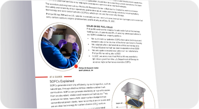 Research and Innovation Phillips 66 is one of the few downstream energy companies with in-house research and development capabilities via our Energy Research & Innovation (ERI) organization. In addition to supporting current operations, this team supports a lower-carbon future by helping to develop and commercialize new technologies. The scientists and engineers at our Phillips 66 Research Center in Bartlesville, Oklahoma, work to enhance the safety and reliability of our operations and to develop air, water and energy solutions, including battery technology and solid oxide fuel cells (SOFCs), which can be used for electricity storage. Phillips 66 has 399 active U.S. patents in specialty carbon, premium coke, low-carbon hydrogen, solid oxide fuel cells, carbon capture, organic photovoltaics and biofuels, as of Dec. 31, 2021. AT A GLANCE SOFCs Explained SOFCs generate electricity efficiently by oxidizing a fuel, such as natural gas, through electrochemical reactions rather than combustion. SOFCs can generate electricity at high efficiencies from an abundant, reliable and inexpensive fuel source. They produce no noise, have a 50% lower-carbon footprint than conventional power plants, have no combustion emissions and are an ideal technology for carbon dioxide (CO 2 ) capture. SOFCs also can be paired with solar- or wind-generated power, ensuring reliable energy even when the sun is not shining or the wind is not blowing. Their quiet, compact, modular design makes them a convenient source of on-site power for homes and businesses. Carpet, Cable Insulation, Nylon Dashboard Odorless Mineral Spirits Polypropylene, Cyclohexane Polypropylene, Cyclohexane, Sulfur Glass Fuel Coke Paint, Adhesives Fuel Coke, Hexane, Heptane, Odorless Mineral Spirits Steel Body Needle Coke, Odorless Mineral Spirits Battery Anode Needle Coke Tire/Rubber Sulfur, Hexane Bumper Polypropylene Aluminum Body Anode Coke SOLID OXIDE FUEL CELLS Phillips 66 continues to progress its solid oxide fuel cell technology, holding nine U.S. patents and 29 U.S. pending patent applications in our SOFC's intellectual property portfolio. • We published our patented SOFCs fabrication technique and research data in the Journal of the American Ceramic Society • We installed a field demonstration of this technology at a Phillips 66 pipeline that has been in operation since 2020 • We anticipate a second application will be installed at a Phillips 66 marketing site in 2022 • In 2021, we announced that Phillips 66 was awarded a $3 million grant from the U.S. Department of Energy to advance high-performance reversible SOFCs 9 Phillips 66 Research Center BARTLESVILLE, OK Single cell Air Fuel SOFC stack OUR BUSINESSES: TODAY AND TOMORROW