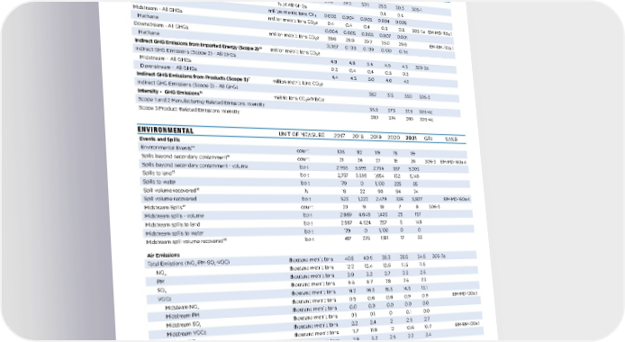 GREENHOUSE GAS 8 UNIT OF MEASURE 2017 2018 2019 2020 2021 GRI SASB Direct GHG Emissions (Scope 1)⁹ Direct GHG Emissions (Scope 1) - All GHGs million metric tons CO₂e 29.0 29.3 30.1 25.5 30.3 305-1 Methane % of All GHGs 0.4 0.4 Methane million metric tons CH₄ 0.003 0.004 0.005 0.004 0.005 Midstream - All GHGs million metric tons CO₂e 0.4 0.4 0.4 0.5 0.5 305-1.a EM-MD-110a.1 Methane 0.004 0.005 0.005 0.007 0.001 Downstream - All GHGs million metric tons CO₂e 28.6 28.9 29.7 25.0 29.8 EM-RM-110a.1 Methane 0.067 0.100 0.109 0.100 0.114 Indirect GHG Emissions from Imported Energy (Scope 2) 10 million metric tons CO₂e Indirect GHG Emissions (Scope 2) - All GHGs 4.8 4.8 5.4 4.6 4.5 305-2a Midstream - All GHGs 0.3 0.4 0.4 0.5 0.3 Downstream - All GHGs 4.4 4.3 5.0 4.0 4.1 Indirect GHG Emissions from Products (Scope 3)¹¹ million metric tons CO₂e Indirect GHG Emissions (Scope 3) - All GHGs 382 313 350 305-3 Intensity - GHG Emissions¹² metric tons CO₂e/MBOe Scope 1 and 2 Manufacturing-Related Emissions Intensity 36.5 37. 3 37. 5 305-4c Scope 3 Product-Related Emissions Intensity 380 374 366 305-4c ENVIRONMENTAL UNIT OF MEASURE 2017 2018 2019 2020 2021 GRI SASB Events and Spills Environmental Events¹³ count 103 112 119 75 119 Spills beyond secondary containment¹⁴ count 21 36 27 18 26 306-3 EM-MD-160a.4 Spills beyond secondary containment - volume bbls 2,936 5,598 2,754 357 5,203 Spills to land¹⁵ bbls 2,757 5,598 1,654 132 5,149 Spills to water bbls 179 0 1,100 225 55 Spill volume recovered¹⁶ % 18 22 90 94 74 Spill volume recovered bbls 523 1,222 2,479 336 3,827 EM-MD-160a.4 Midstream Spills¹⁷ count 20 19 18 7 8 306-3 Midstream spills - volume bbls 2,869 4,648 1,403 25 157 Midstream spills to land bbls 2,567 4,624 257 5 148 Midstream spills to water bbls 179 0 1,100 0 0 Midstream spill volume recovered¹⁸ bbls 417 275 1,181 17 33 Air Emissions Total Emissions (NO x -PM-SO x -VOC) thousand metric tons 40.8 40.6 38.3 35.5 34.5 305-7a NO x thousand metric tons 12.2 12.4 12.6 11.5 11.6 PM thousand metric tons 2.9 3.2 2.7 2.3 2.5 SO x thousand metric tons 9.5 8.7 7. 8 7. 5 7. 3 VOCs thousand metric tons 16.2 16.3 15.3 14.3 13.1 Midsteam NO x thousand metric tons 0.5 0.6 0.6 0.9 0.9 EM-MD-120a.1 Midstream PM thousand metric tons 0.0 0.0 0.0 0.0 0.0 Midstream SO x thousand metric tons 0.1 0.1 0 0.1 0.0 Midstream VOCs thousand metric tons 2.2 2.4 2 2.6 2.7 Refining NO x thousand metric tons 11.7 11.8 12 10.6 10.7 EM-RM-120a.1 Refining PM thousand metric tons 2.8 3.2 2.6 2.2 2.4 Refining SO x thousand metric tons 9.5 8.6 7. 8 7. 5 7. 3 Refining VOCs thousand metric tons 12.9 12.9 12.3 10.7 10.4 63 63 PERFORMANCE DATA