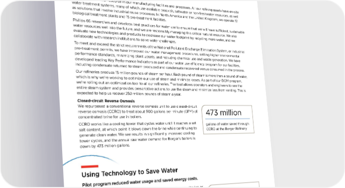 WATER CONSERVATION Water is an essential resource in our manufacturing facilities and processes. All our refining assets have on-site water treatment systems, many of which use available brackish, saltwater or non-freshwater resources, as well as solutions that involve industrial reuse processes. In North America and the United Kingdom, we operate 12 biological treatment plants and 15 pre-treatment facilities. Phillips 66 researches and develops best practices for water use to ensure that we will have sufficient, sustainable water resources well into the future, and we are responsibly managing this critical natural resource. We also evaluate new technologies and products to decrease our water footprint by recycling more water, and we collaborate with research institutions to solve water challenges. To meet and exceed the strict requirements of the National Pollutant Discharge Elimination System, or industrial pre-treatment permits, we have improved our water management procedures, setting higher environmental performance standards, minimizing plant upsets, and reducing chemical use and waste generation. We have developed leading Key Performance Indicators as part of our water use efficiency program for our facilities, including condensate returned to steam produced and condensate recovered versus consumed in the process. Our refineries produce 15 million pounds of steam per hour. Each pound of steam is more than a pound of water, which is why we’re working to optimize our use of steam and minimize losses. As part of our DOM program, we’re rolling out an optimization tool to all our refineries. The tool allows operators and engineers to see the entire steam system and provides prescriptive actions to use the steam and minimize loss from venting. This is expected to help us recover 250 million pounds of steam a year. Using Technology to Save Water Pilot program reduced water usage and saved energy costs. Our Billings and Bayway refineries implemented steam trap monitoring as part of the DOM program. Using hand-held acoustic sensors coupled with a cloud-based analytics program, steam traps were periodically tested. Initial surveys identified areas for prioritized maintenance. Repairing the identified traps netted $1.3 million per year savings in energy costs at the two facilities. The work also helped improve third-party energy intensity performance statistics and reduce GHG emissions. Three additional refineries will start the program in 2022 and remaining refineries are scheduled to be included in 2023. $1.3 million saved in 2021 energy costs by reducing steam losses at Billings and Bayway refineries Closed-circuit Reverse Osmosis We repurposed a conventional reverse osmosis unit to use closed-circuit reverse osmosis (CCRO) to treat about 900 gallons per minute (GPM) of concentrated brine for use in boilers. CCRO works like a cooling tower that cycles water until it reaches a set salt content, at which point it blows down the brine while continuing to generate clean water. We see results in significantly improved cooling tower cycles, and the annual raw water demand for Borger's boilers is down by 473 million gallons. 473 million gallons of water saved through CCRO at the Borger Refinery Environmental Stewardship 31 ENVIRONMENT AND SAFETY