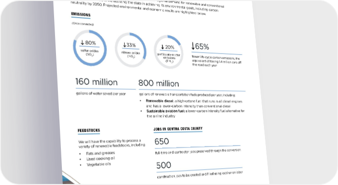 EMISSIONS JOBS IN CONTRA COSTA COUNTY 650 full-time and contractor jobs preserved through the conversion 500 construction jobs to be created and filled using local union labor ~4 million projected construction work-hours 800 million gallons of renewable transportation fuels produced per year, including: • Renewable diesel: a high-cetane fuel that runs in all diesel engines and has a lower-carbon intensity than conventional diesel • Sustainable aviation fuel: a lower-carbon intensity fuel alternative for the airline industry (Once converted) The Rodeo Renewed project will help California meet regional demand for renewable and conventional transportation fuels while assisting the state in achieving its environmental goals, including carbon neutrality by 2050. Projected environmental and economic results are highlighted below. 160 million gallons of water saved per year 80% sulfur oxides (SO X ) 20% particulate-matter emissions (PM 10 ) FEEDSTOCKS We will have the capability to process a variety of renewable feedstocks, including: • Fats and greases • Used cooking oil • Vegetable oils 65% fewer life-cycle carbon emissions, the equivalent of taking 1.4 million cars off the road each year 33% nitrous oxides (NO X ) AT A GLANCE Rodeo Renewed 11 OUR BUSINESSES: TODAY AND TOMORROW