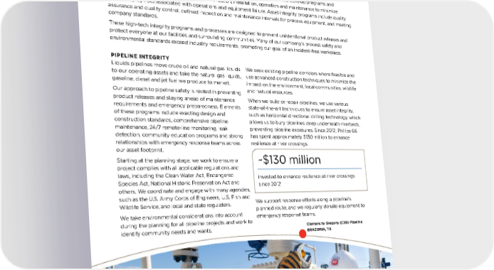 Asset Integrity Ensuring the integrity of our assets is a crucial HSEMS component. Business units develop programs and procedures to ensure proper asset design, fabrication, installation, operation and maintenance to minimize asset integrity risks associated with operations and equipment failure. Asset integrity programs include quality assurance and quality control, defined inspection and maintenance intervals for process equipment, and meeting company standards. These high-tech integrity programs and processes are designed to prevent unintentional product releases and protect everyone at our facilities and surrounding communities. Many of our company's process safety and environmental standards exceed industry requirements, promoting our goal of an incident-free workplace. PIPELINE INTEGRITY Liquids pipelines move crude oil and natural gas liquids to our operating assets and take the natural gas liquids, gasoline, diesel and jet fuel we produce to market. Our approach to pipeline safety is rooted in preventing product releases and staying ahead of maintenance requirements and emergency preparedness. Elements of these programs include exacting design and construction standards, comprehensive pipeline maintenance, 24/7 remote-line monitoring, leak detection, community education programs and strong relationships with emergency response teams across our asset footprint. Starting at the planning stage, we work to ensure a project complies with all applicable regulations and laws, including the Clean Water Act, Endangered Species Act, National Historic Preservation Act and others. We coordinate and engage with many agencies, such as the U.S. Army Corps of Engineers, U.S. Fish and Wildlife Service, and local and state regulators. We take environmental considerations into account during the planning for all pipeline projects and work to identify community needs and wants. We seek existing pipeline corridors where feasible and use advanced construction techniques to minimize the impact on the environment, local communities, wildlife and natural resources. When we build or repair pipelines, we use various state-of-the-art techniques to ensure asset integrity, such as horizontal directional drilling technology, which allows us to bury pipelines deep underneath riverbeds, preventing pipeline exposures. Since 2012, Phillips 66 has spent approximately $130 million to enhance resilience at river crossings. We support response efforts along a pipeline’s planned route, and we regularly donate equipment to emergency response teams. ~$130 million invested to enhance resilience at river crossings since 2012 28 PHILLIPS 66 2022 SUSTAINABILITY REPORT 28 Clemens to Gregory (C2G) Pipeline BRAZORIA, TX PHILLIPS 66 2022 SUSTAINABILITY REPORT OUR BUSINESSES: TODAY AND TOMORROW ENVIRONMENT AND SAFETY GOVERNANCE STAKEHOLDER ENGAGEMENT