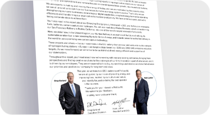 To Our Stakeholders, Each year, as we report our sustainability efforts, we are afforded a chance to reflect on our successes and acknowledge the work that still lies ahead. On May 1, 2022, we celebrated 10 years of providing energy and improving lives at Phillips 66. It's been a decade of progress built on our nearly 150-year heritage. Our high-performing organization stands on our values of safety, honor and commitment and remains focused on operating excellence, growth, returns and distributions. We are experts in making and moving the energy of today, and we are motivated by the opportunities we see all around us to optimize our businesses to thrive as energy systems evolve. That's why we are strengthening our core businesses, expanding our digital capabilities, using technology to improve operating efficiencies and transforming our organization to increase productivity. We have ambitious goals, and we’re taking deliberate steps to achieve them. You’ll also read in this report about our Emerging Energy group, introduced in 2021, and its focus on renewable fuels, batteries, carbon capture and hydrogen. You will also read about Rodeo Renewed, which is transforming our San Francisco Refinery in Rodeo, California, into one of the world's largest renewable fuels plants. Here, we detail how, in the United Kingdom, our Humber Refinery is an example of the future of refining. Its sustainable aviation fuel is now powering flights for British Airways, and it stands poised to be the first refinery in the world to use a promising new carbon capture technology. These projects and others — like our investments in the U.S. battery chain and our joint venture to build a network of hydrogen fueling stations in Europe — are tangible steps toward our 2030 and 2050 GHG emissions reduction targets. As we move forward, we will strive to be capital-disciplined, energy efficient and supportive of our stakeholders. Throughout this report, you'll read about how we're working with new and existing companies, bringing fresh perspectives and finding creative solutions to the challenges of our time. Innovation is part of who we are, and it is driven by our employees. They are empowered to think big, try new things and develop solutions that advance our priorities and position our company for long-term resilience. This year, as we transition CEO leadership at Phillips 66, we are all guided by our vision of providing energy and improving lives, inspired by our culture and values, and intently focused on being the best operator in the business. Thank you for your interest in Phillips 66. We welcome your feedback. In safety, honor and commitment, Mark Lashier Greg Garland Mark Lashier President and CEO Greg Garland Executive Chairman 2 PHILLIPS 66 2022 SUSTAINABILITY REPORT