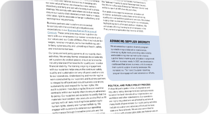 BUSINESS PARTNER, SUPPLY CHAIN AND SOCIAL SUPPLIER STANDARDS The products manufactured in our refineries and developed along the supply chain significantly contribute to local, state and national economies. In keeping with our core value of honor, we choose business partners objectively and fairly and act with honesty in all business dealings. We comply with laws where we do business to ensure our supply chain standards meet minimum wage, child labor, right to associate or bargain collectively, and working-hour requirements. Business partners and suppliers are expected to comply with the contractual obligations and expectations in our Business Partner Principles of Conduct . These principles require our suppliers to work with our employees in a manner consistent with our values and our Code of Ethics. Priorities include fair wages, nondiscrimination, no human trafficking, anti- bribery, cybersecurity, and upholding all health, safety and environmental laws. Our procurement policy governs all our supply chain activities. We employ formal processes to consistently vet suppliers to protect people, ensure adherence to industry-standard frameworks for quality and monitor financial stability. Maintaining ongoing engagement with our suppliers helps ensure the continued safety, quality and sustainable delivery of goods and services to our operations. Understanding and monitoring the work conducted by our suppliers and business partners is integral to efficient and robust business operations, sustainability and respect for human rights. We audit suppliers’ manufacturing facilities and examine contracts within our supply chain to ensure adherence to policy. Our suppliers are expected to certify that the materials incorporated into products sold to Phillips 66 comply with all laws, including those pertaining to human rights, slavery and human trafficking. We engage with suppliers to enhance our operating performance through innovative products and the execution of continuous improvement opportunities. Supply Chain Sustainability Phillips 66 seeks to do business with diverse businesses across all our operations, and we are committed to providing equal and impartial opportunities. This approach stimulates local economic development and enhances our long- term business performance by improving supplier responsiveness, competition and sustainability. We actively participate in organizations that support the development of diverse businesses in the United States. This support includes our corporate memberships in the National Minority Supplier Development Council, the Women’s Business Enterprise National Council and active support of API diversity activities. Our goals encourage the expanded utilization of a diverse, sustainable supply base while delivering quality and competitive goods and services. We piloted supply chain sustainability training for our employees, highlighting items of impact and our initiatives. We anticipate offering training to all employees in the Procurement organization by the end of 2022. POLITICAL AND PUBLIC POLICY PROCESS Phillips 66 participates in the U.S. legislative and regulatory policy development and political process to serve the best interests of our shareholders, our workforce and other stakeholders. Our operations are highly regulated and are affected by actions at many levels of government. Our public policy activities include education and advocacy efforts at the local, state and federal levels. We are also committed to complying with all applicable state and federal rules on lobbying and disclosures. Our Political Giving and Activity Policy governs our actions. It discloses political activity by the board of directors and management and lays out the criteria by which we evaluate contributions made over the past five years. In addition, the board’s Public Policy and Sustainability Committee has oversight of political risks and receives updates from the board throughout the year. ADVANCING SUPPLIER DIVERSITY We advanced our supplier diversity program by establishing collaborative relationships, developing digital tools, providing data visibility and establishing internal metrics for diverse supplier benchmarking and utilization in alignment with our business needs. In 2021, we developed a dashboard that allows business units to analyze their current supplier diversity landscape. We increased our Tier 1 and 2 supplier reporting program to engage with and advance our efforts. 42 PHILLIPS 66 2022 SUSTAINABILITY REPORT OUR BUSINESSES: TODAY AND TOMORROW ENVIRONMENT AND SAFETY GOVERNANCE STAKEHOLDER ENGAGEMENT