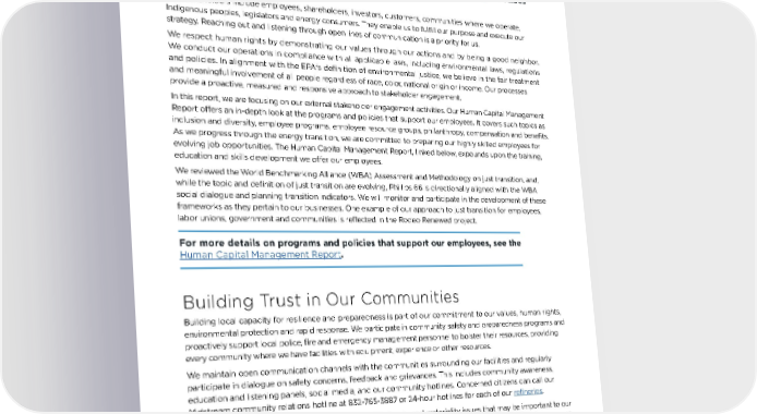 Stakeholder engagement is part of our commitment to social responsibility. Our approach is one of mutual respect. This means respecting human rights, demonstrating our values through our actions and being a good neighbor. Our stakeholders include employees, shareholders, investors, customers, communities where we operate, Indigenous peoples, legislators and energy consumers. They enable us to fulfill our purpose and execute our strategy. Reaching out and listening through open lines of communication is a priority for us. We respect human rights by demonstrating our values through our actions and by being a good neighbor. We conduct our operations in compliance with all applicable laws, including environmental laws, regulations and policies. In alignment with the EPA's definition of environmental justice, we believe in the fair treatment and meaningful involvement of all people regardless of race, color, national origin or income. Our processes provide a proactive, measured and responsive approach to stakeholder engagement. In this report, we are focusing on our external stakeholder engagement activities. Our Human Capital Management Report offers an in-depth look at the programs and policies that support our employees. It covers such topics as inclusion and diversity, employee programs, employee resource groups, philanthropy, compensation and benefits. As we progress through the energy transition, we are committed to preparing our highly skilled employees for evolving job opportunities. The Human Capital Management Report, linked below, expounds upon the training, education and skills development we offer our employees. We reviewed the World Benchmarking Alliance (WBA) Assessment and Methodology on just transition, and, while the topic and definition of just transition are evolving, Phillips 66 is directionally aligned with the WBA social dialogue and planning transition indicators. We will monitor and participate in the development of these frameworks as they pertain to our businesses. One example of our approach to just transition for employees, labor unions, government and communities is reflected in the Rodeo Renewed project. For more details on programs and policies that support our employees, see the Human Capital Management Report . Building Trust in Our Communities Building local capacity for resilience and preparedness is part of our commitment to our values, human rights, environmental protection and rapid response. We participate in community safety and preparedness programs and proactively support local police, fire and emergency management personnel to bolster their resources, providing every community where we have facilities with equipment, experience or other resources. We maintain open communication channels with the communities surrounding our facilities and regularly participate in dialogue on safety concerns, feedback and grievances. This includes community awareness, education and listening panels, social media, and our community hotlines . Concerned citizens can call our Midstream community relations hotline at 832-765-3887 or 24-hour hotlines for each of our refineries . We cast wide nets internally and externally to identify trends and materiality issues that may be important to our stakeholders so that we can collect and understand essential data and perspectives. We tap into various sources inside and outside the sector, across countries and political views, and cover physical, policy, human capital, reputational risk and opportunities-related information. We routinely acquire additional information about stakeholder interests from sources including customers, in-person interviews and surveys. Data comes from investors, service companies, consultants, industry bodies, research firms and analyst reports. We also rely on sources such as governmental databases, environmental and social nongovernmental organizations, global policy bodies, ratings agencies and indices, community advisory boards, and scorers and activists in Environmental, Social and Governance (ESG) areas. 56 PHILLIPS 66 2022 SUSTAINABILITY REPORT OUR BUSINESSES: TODAY AND TOMORROW ENVIRONMENT AND SAFETY GOVERNANCE STAKEHOLDER ENGAGEMENT
